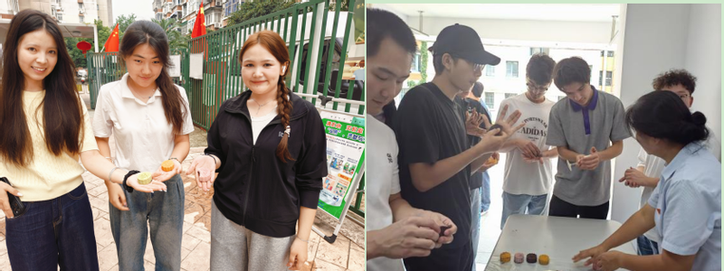 活动现场,一张张桌子上摆放着制作月饼所需的食材和工具,有面团、馅料、模具等。宿管阿姨们化身为月饼制作的“老师”,她们耐心地向学生们讲解月饼的制作步骤和技巧。从揉面团,到包馅、成型,每一个环节都详细演示,确保学生们能够清楚地了解整个制作过程。预科班同学们聚精会神地听着,不时地向阿姨们提问,现场气氛十分活跃。