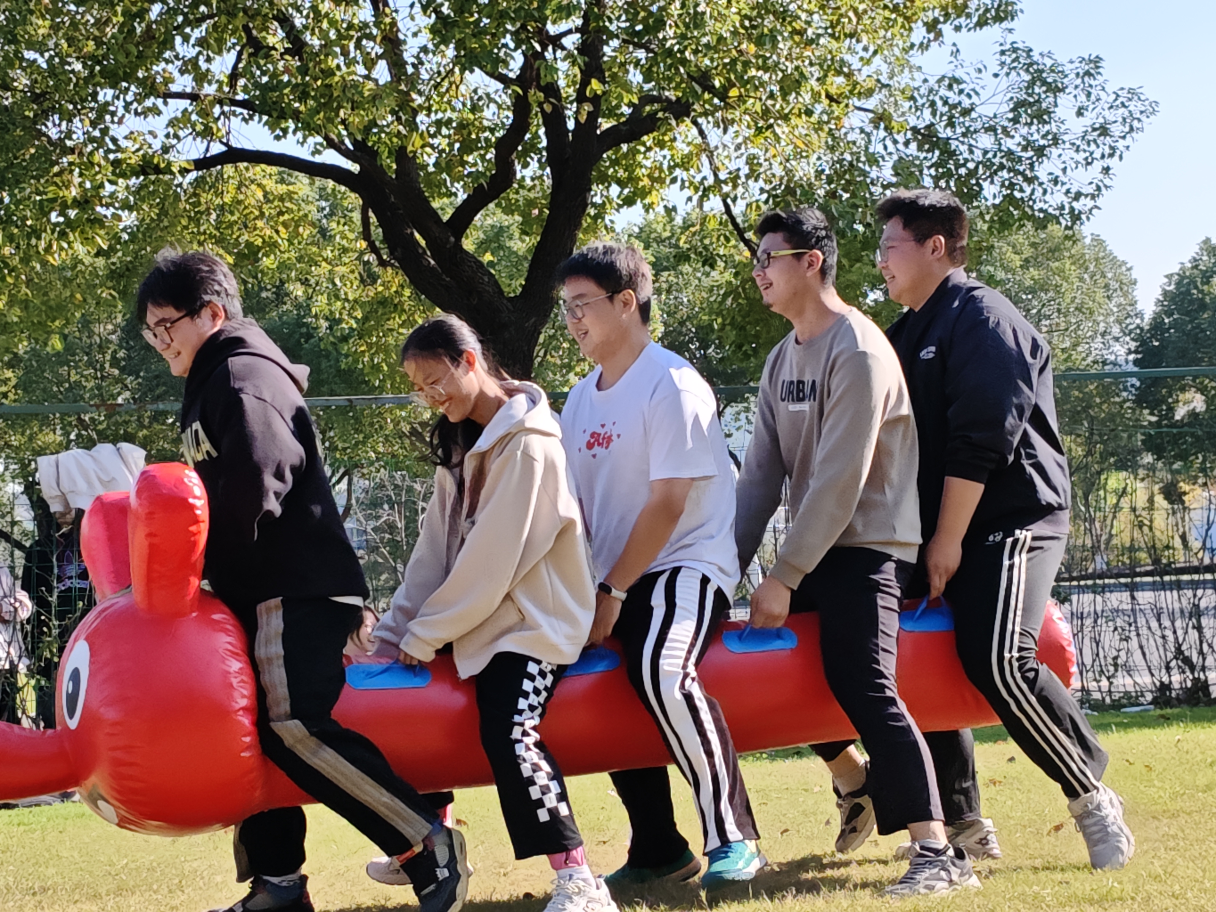 在“毛毛虫接力赛”中,队员跨坐在“毛毛虫”上,默契配合、同步发力,伴随着此起彼伏的呐喊声与欢呼声,向着终点奋勇前进,展现了继教院学子齐心协力、团结一致的精神风貌。