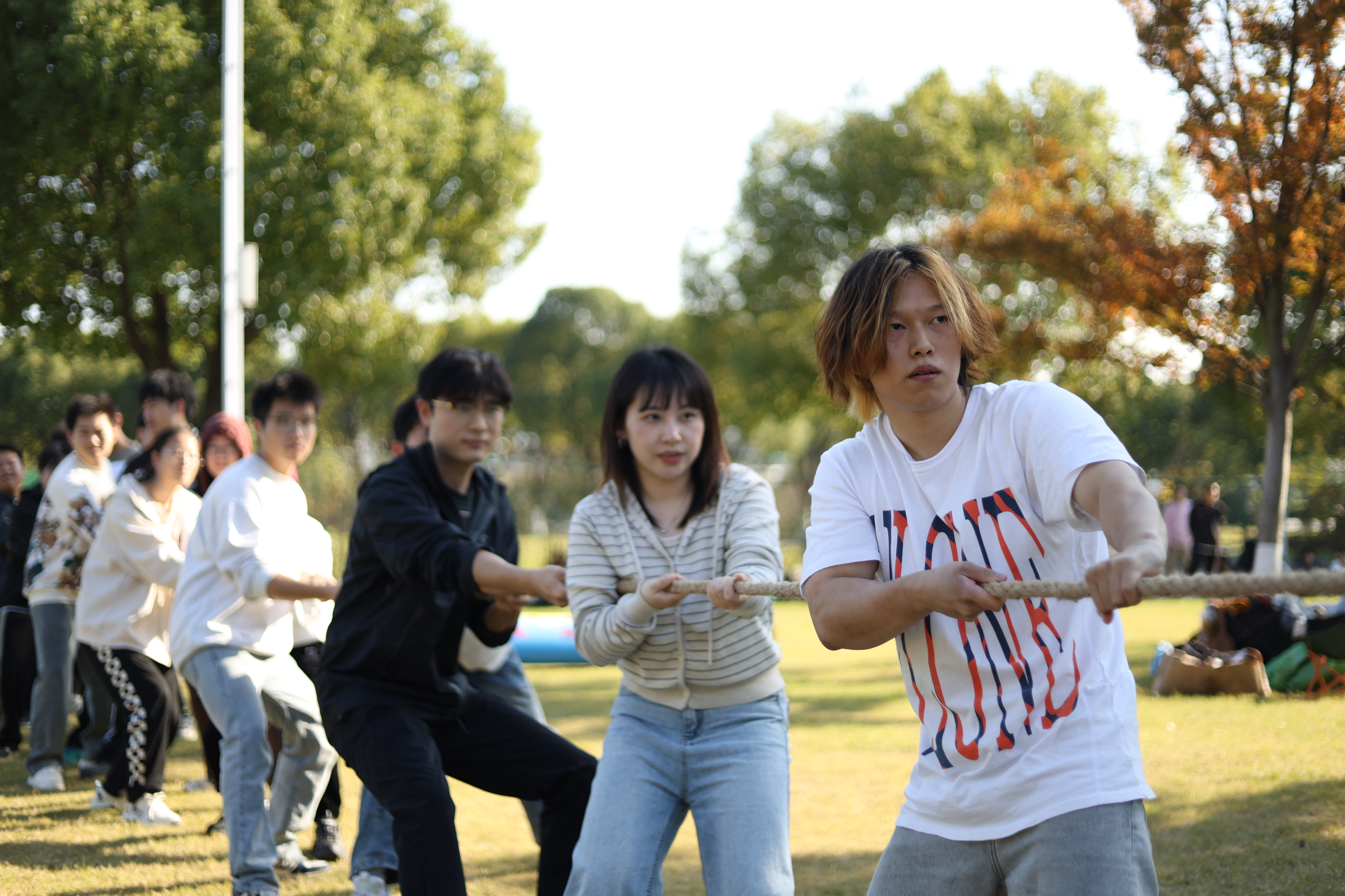 拔河比赛现场,气氛热烈而紧张。同学们怀着必胜的决心,紧握绳索,劲往一处使,奋力拼搏。